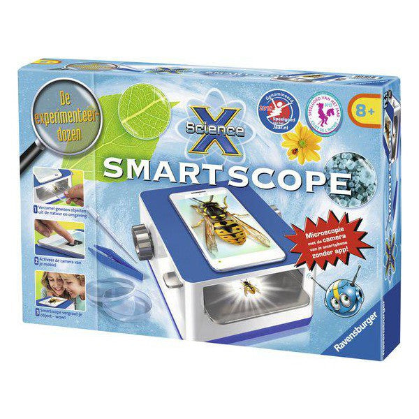 Overige informatie: Duik in de microscopische wereld! Met de Science X® Smartscope van Ravensburger kunnen kinderen heel makkelijk voorwerpen uit de natuur en het dagelijks leven onder de loep nemen. De Smartscope kan met iedere willekeurige smart Phone of tablet gebruikt worden zonder de installatie van een app of het speciaal prepareren van voorwerpen. En hij is zo stevig, dat hij ook gewoon in de vrije natuur gebruikt kan worden.