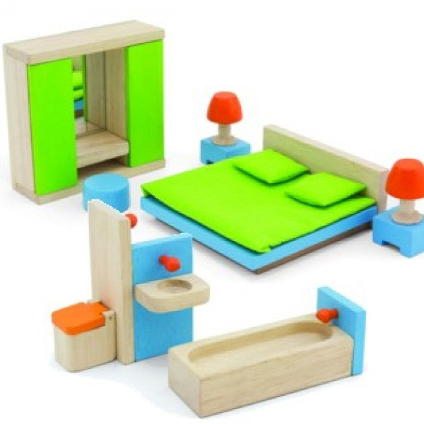 Deze slaap en badkamer set van Pintoy is een set ter aanvulling van het Star Loft poppenhuis uit deze serie. De set is uitgevoerd in naturel en in de heldere kleuren groen, blauw en oranje en bestaat uit een bed met twee nachtkastjes en lampen, poef en kledingkast, ligbad, toilet en wasbak. Deze woonaccessoires mag je niet missen in je houten poppenhuis.
