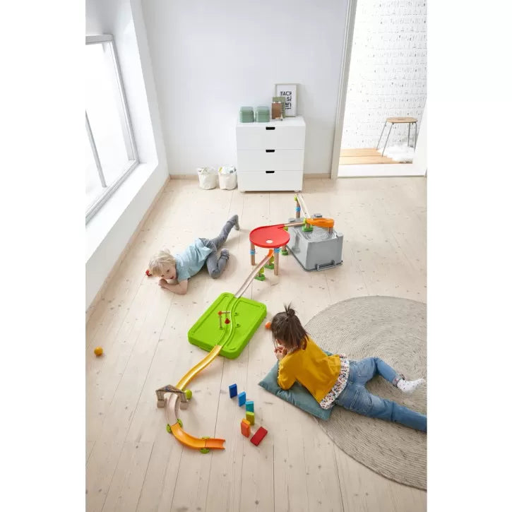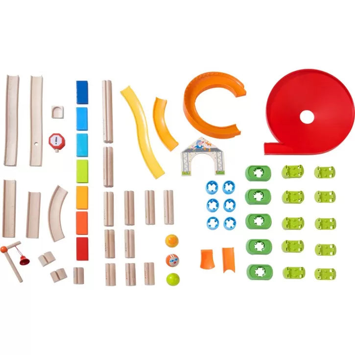 Deze grote Basisset van Haba bevat meer dan genoeg onderdelen om kinderen voor lange tijd van plezier te kunnen voorzien. De Haba Knikkerbaan bevat onder andere brugdelen, tunnelstenen en hellingen en bevat ook nog eens 6 knikkers die het tot een spannend geheel maken. Deze Haba Knikkerbaan biedt een hoop plezier voor een kleine prijs.